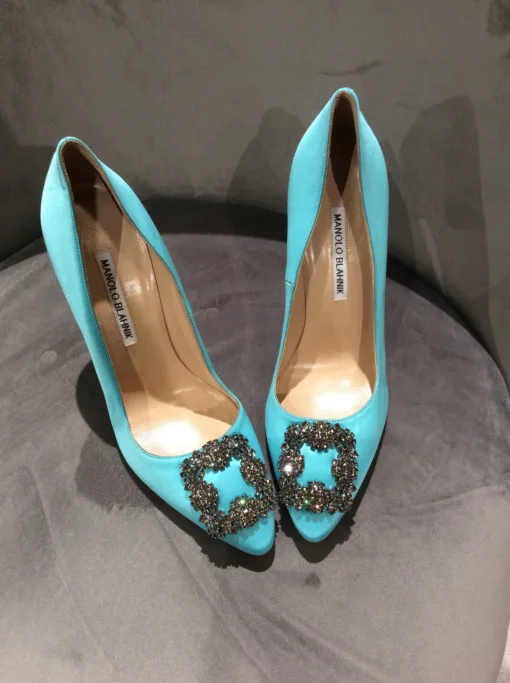 Manolo Blahnik Hangisi – Satin Jewel Buckle Heels (Blue)